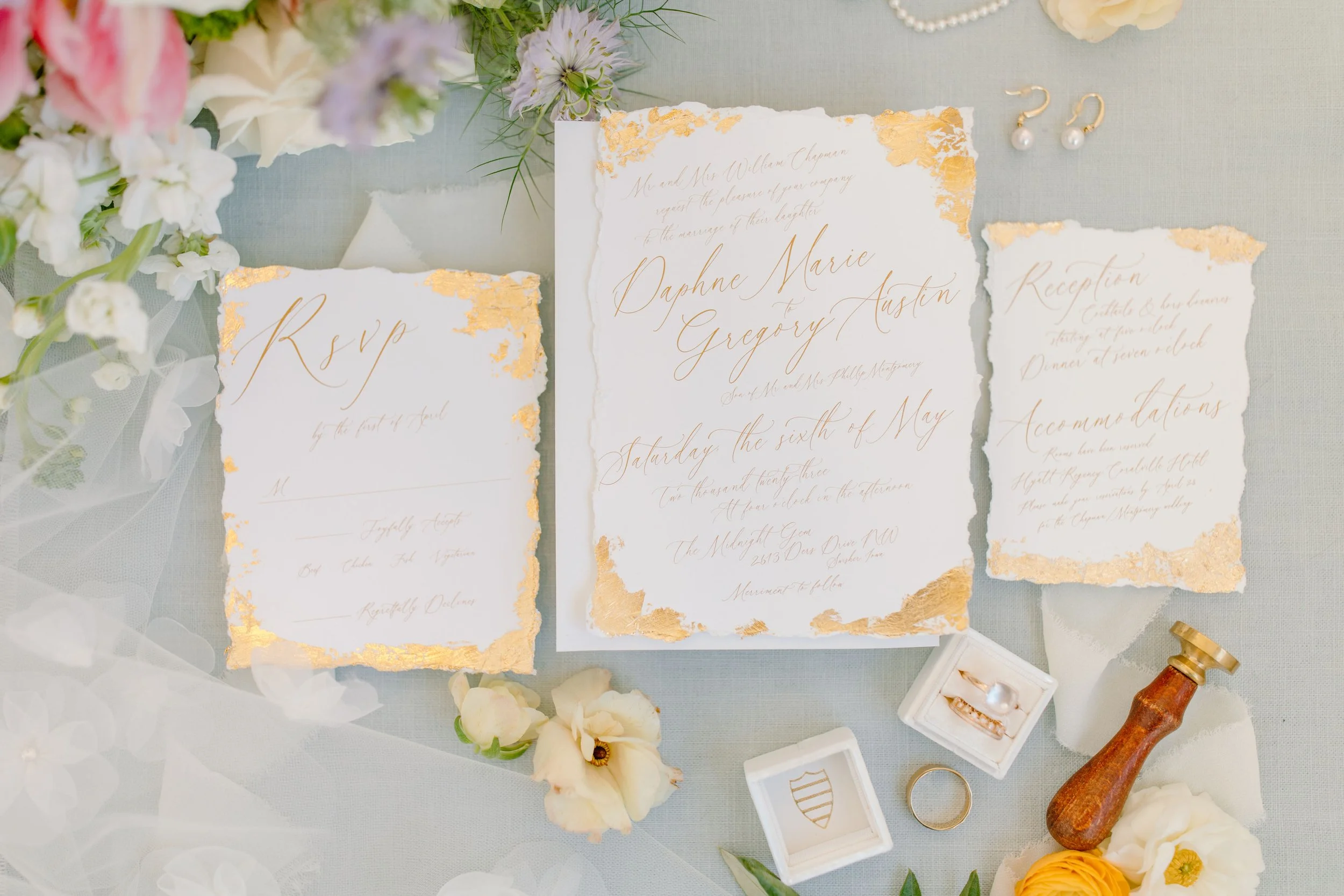We had lots of fun creating this custom wedding suite! It had the whimsy of Bridgerton, taking inspiration from the show's regal style and garden-scapes. The whole day had a light and airy feel.